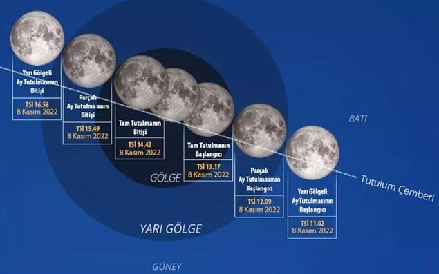 2022 yılının ikinci Ay tutulması, 8 Kasım Salı günü saat 14:00’da gerçekleşecek. Tutulmanın başlangıcı, Türkiye saati ile 11:02’de, Ay’ın yarı gölgeye girişi ile başlayacak. Tam tutulma saati 13:17 ile 14:42 aralığında gerçekleşecek. Tutulmanın 16:56’da, Ay’ın yarı gölgeden çıkması ile sona ereceği söylendi.