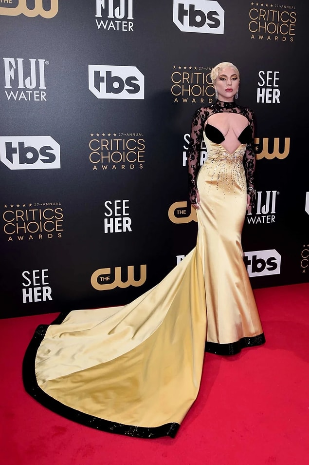 Lady Gaga hem kıyafetleriyle hem de makyajlarıyla en yavuz seçimleri yapıyor. Kırmızı halıda herkesin merakla beklediği Lady Gaga görünümleri daima çok konuşuluyor. Sarı tonlarındaki elbisesini sarı farıyla tamamlayarak uyumlu bir görünüm sağlamış. Yalnızca gözlere odaklandığı bu makyajda dudaklar epey sade!