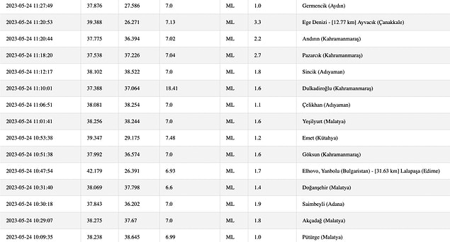 24 Mayıs Çarşamba Son Sarsıntılar Listesi