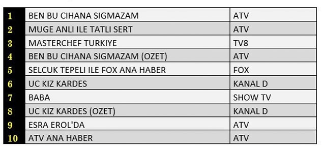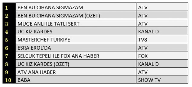 AB’de ise 1.sırada “Ben Bu Cihana Sığmazam”, 2.sırada “Müge Anlı İle Tatlı Sert” 3.sırada TV8’de yayınlanan “Masterchef Türkiye” yer aldı.