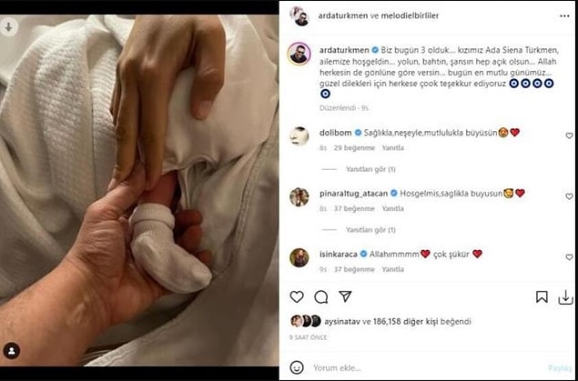 Instagram hesabından eşi Elbirliler ile ortak bir paylaşım yayınlayan Türkmen, ‘Biz bugün 3 olduk… Kızımız Ada Siena Türkmen, ailemize güzel geldin. Yolun, bahtın, talihin daima açık olsun. Allah herkesin de gönlüne nazaran versin. Bugün en keyifli günümüz… Hoş dilekleri için herkese çok teşekkür ediyoruz’ dedi.