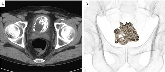 Mesaneye yerleşen ip, mesane kasıldıkça kıvrıldığı için ameliyatla karnından çıkarıldı.
