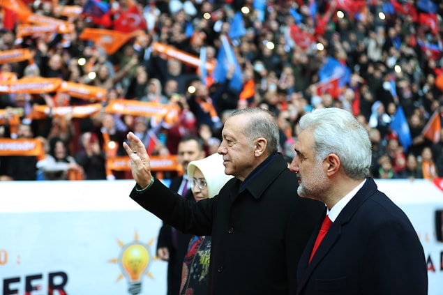 ‘Bizler birbirine kenetlenmiş parmaklar, tuğlalar üzere saflarımızı sıkı tuttukça önümüze hangi tuzağı kurarlarsa kursunlar, vız gelir. Başlattığımız demokrasi ve kalkınma atağını adım adım ileriye taşıyarak, ülkemizin üzerinden vesayetin gölgesini nasıl kaldırdıysak, yoklukları, sefaleti, geri kalmışlığı nasıl tarihe gömdüysek, içeride ve dışarıda tertiplenen kumpasları nasıl bozduysak, terör örgütlerinin dişlerini nasıl söktüysek, darbecileri nasıl bozguna uğrattıysak, ekonomik tetikçileri nasıl şaşırttıysak, felaket senaryolarını nasıl boşa çıkardıysak, inşallah 2023’le ilgili sinsi plan ve hevesleri de birebir formda çöpe atacağız, çöpe…’