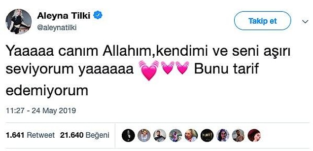 Aleyna Tilki ne yapıyor, ne ediyor kesinlikle kendinden kelam ettirecek bir gündem yaratıyor. Bu sefer de attığı bir tweet ile ortalık birbirine girmiş durumda. Gelin bakalım bu sefer nelerle uğraşacağız?