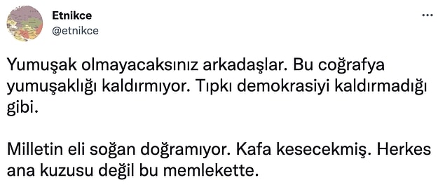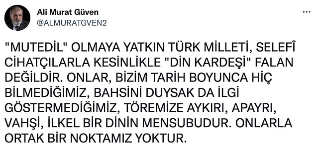 Bağcılar’daki olaya reaksiyon gösterenlerden biri de bu Twitter kullanıcısıydı. Kullanıcı yaptığı paylaşımda baş kesmek için bekleyen binlerce selefinin Türkiye’de yaşadığını belirtti.
