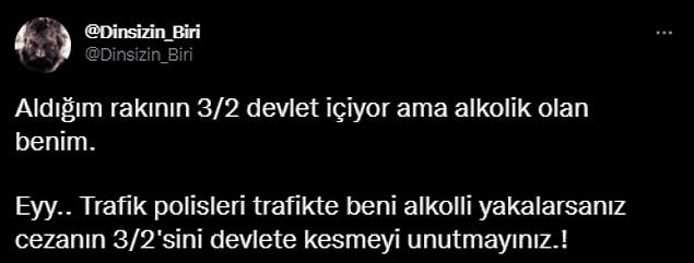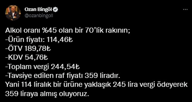 Yüzde 45 oranında alkol içeren 70’lik bir rakının eser fiyatının 114,46 TL olduğunu, 189,78 TL ÖTV, 54,76 TL de KDV eklendiğinde, şişe bazında toplam verginin 244,54 TL olurken, raf fiyatının da 359 TL olduğunu belirtiyor. Bu hesapla 114 liralık bir esere yaklaşık 245 lira vergi ödenerek 359 liraya alındığını belirtiyor.