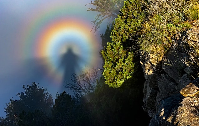 ‘Brocken Spectre’ olarak bilinen bir fenomen, Haziran 2021’de İspanya’nın Tavertet kentindeki bir uçurumun üzerinde görülüyor. Brocken Spectre olayı, bir gözlemcinin (bu durumda fotoğrafçının) bir bulut yahut sis üzerine düşen büyük gölgesidir. Bir kişi bunun üzere bir zirvede dururken gerisinden Güneş ışığı vurursa, kişinin gölgesi aşağıdaki buluta yansıtılabilir.