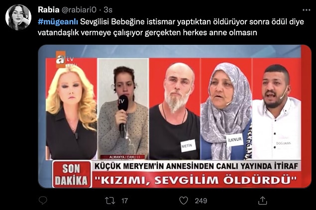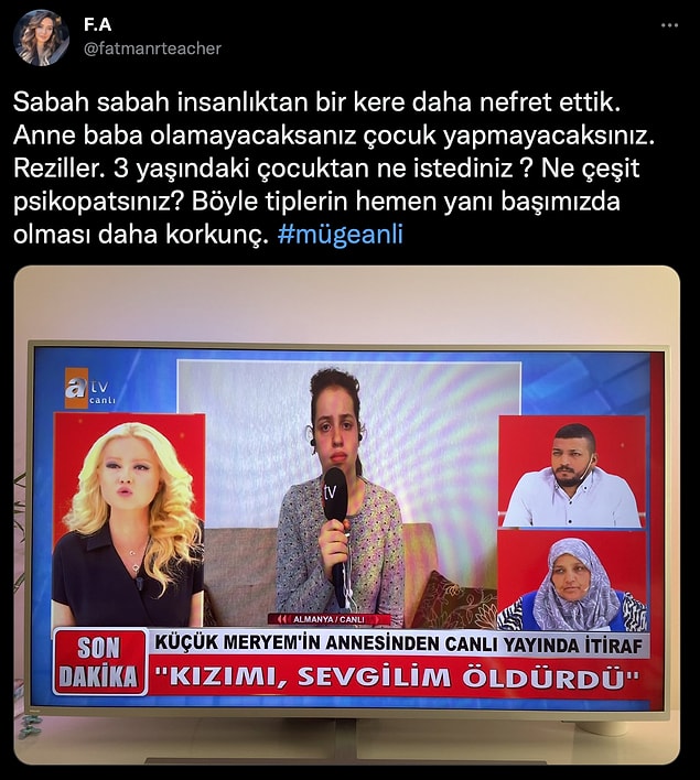 Biliyorsunuz ki gündüz jenerasyonu programları ortasında en tanınan olan üretimlerden biri de Müge Anlı ile Tatlı Sert. Araştırmacı ve gazeteci Müge Anlı’nın sunduğu programda işlenen olaylar vakit zaman tüm Türkiye’nin kanını donduruyor adeta. ATV ekranlarında yayınlanan programda günlerdir 3 yaşındaki Meryem bebeğin kuşkulu vefatı araştırılıyordu. Bugünkü kısımda acı bir itiraf geldi ve anne Melisa, bebeğini sevgilisi Recep’in öldürdüğünü söyledi. Yaşanan cinayete dair ayrıntıları da açıklayan annenin söyledikleri toplumsal medyanın da gündemine boma üzere düştü. Başta Demet Akalın olmak üzere binlerce kişi olaya reaksiyon gösterdi.