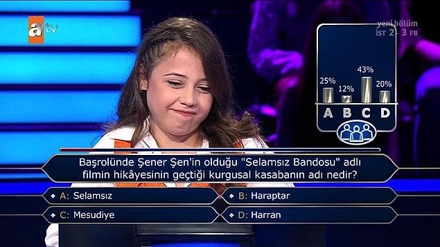 10. ATV’de yayın hayatına devam eden Kim Milyoner Olmak İster müsabakasında sorulan Şener Şen sorusu toplumsal medyanın gündemine oturdu. Soruda seyirci joker hakkını kullanan yarışmacı seyircilerin azizliğine uğradı.