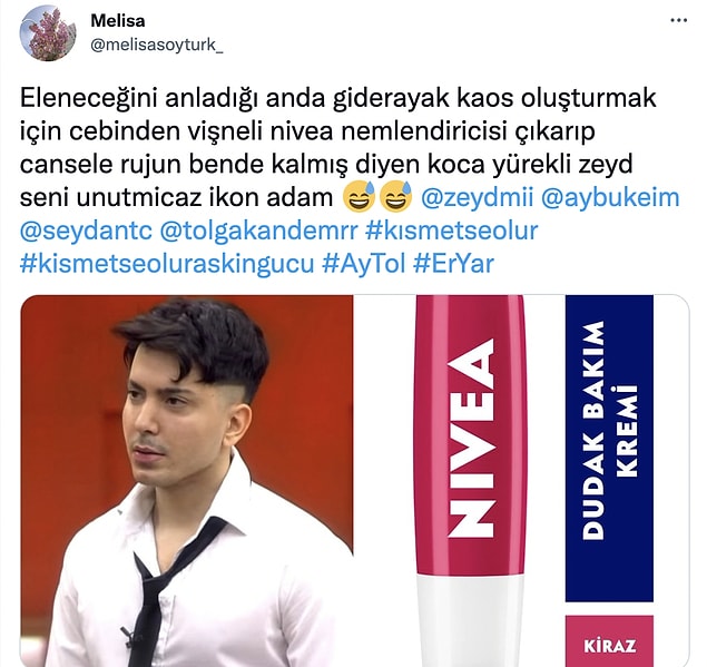 Giderayak son sefer Cansel’e bulaşmak isteyen Zeyd, cebinden çıkardığı dudak kollayıcı ruju Cansel’e uzatarak ‘Rujun bende kalmış’ dedi. Başta Cansel olmak üzere herkes şok içinde kalırken Cansel, “Ne yapmaya çalışıyorsun? Bu benim rujum değil.” diyerek Zeyd’e ruju geri verdi.
