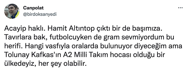Faroe Adaları karşısında tarihimize kara leke olarak geçecek mağlubiyetin akabinde mikrofonlara konuşan Ulusal Gruplar Sorumlusu Hamit Altıntop’un üslubu toplumsal medyada çok ancak çok tartışıldı. Lüksemburg’dan 3 gol, Faroe Adaları’ndan iki gol yiyen A Ulusal Kadro’dan sorumlu olan Hamit Altıntop’un, teknik yönetici Stefan Kuntz’un kadronun başında kalacağını anlatırken masaya vurması reaksiyon çekti.