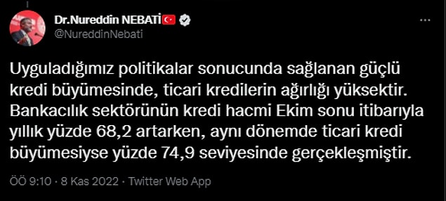 “Uyguladığımız siyasetler sonucunda sağlanan güçlü kredi büyümesinde, ticari kredilerin yükü yüksektir. Bankacılık dalının kredi hacmi Ekim sonu prestijiyle yıllık yüzde 68,2 artarken, birebir periyotta ticari kredi büyümesiyse yüzde 74,9 düzeyinde gerçekleşmiştir.”