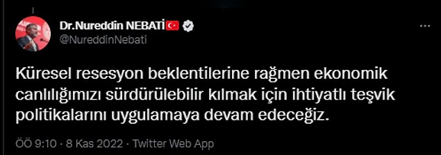 Hazine ve Maliye Bakan Nebati, ‘Küresel resesyon beklentilerine karşın ekonomik canlılığımızı sürdürülebilir kılmak için ihtiyatlı teşvik siyasetlerini uygulamaya devam edeceğiz.’ dedi.