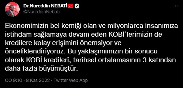 “Ekonomimizin bel kemiği olan ve milyonlarca insanımıza istihdam sağlamaya devam eden KOBİ’lerimizin de kredilere kolay erişimini önemsiyor ve önceliklendiriyoruz. Bu yaklaşımımızın bir sonucu olarak KOBİ kredileri, tarihî ortalamasının 3 katından daha fazla büyümüştür.”