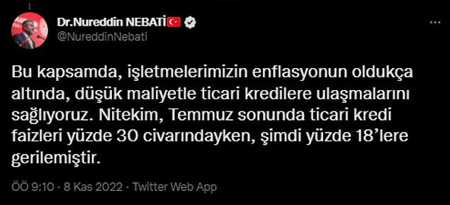 “Bu kapsamda, işletmelerimizin enflasyonun epeyce altında, düşük maliyetle ticari kredilere ulaşmalarını sağlıyoruz. Gerçekten, Temmuz sonunda ticari kredi faizleri yüzde 30 civarındayken, artık yüzde 18’lere gerilemiştir.”