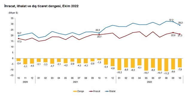 Ekim ayında dış ticaret açığı bir evvelki yılın birebir ayına nazaran %421,7 artarak 1 milyar 509 milyon dolardan, 7 milyar 874 milyon dolara yükseldi. İhracatın ithalatı karşılama oranı 2021 Ekim ayında %93,2 iken, 2022 Ekim ayında %73,0’a geriledi.