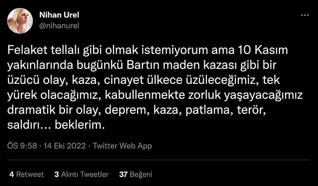 Taksim’deki patlamayı bir ay öncesinden tarihiyle birlikte bildiği argüman edilen Nihan Urel yaptığı paylaşımda, ”10-11-12-13 Kasım üzücü olaylar olmasın inşallah.” tabirlerini kullanmıştı.