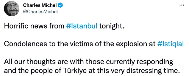 “Bu gece İstanbul’dan dehşetli haberler geldi. İstiklal’deki patlamada hayatını kaybedenlerin ailelerine başsağlığı diliyorum.”
