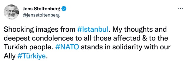 “İstanbul’dan şok edici imajlar geldi. Patlamadan etkilenen herkese ve Türk halkına en içten taziyelerimi sunuyorum. NATO, müttefikimiz Türkiye ile dayanışma içerisindedir.”