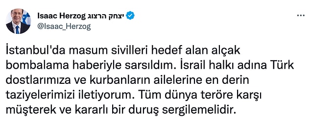 İsrail Cumhurbaşkanı Isaac Herzog resmi Twitter hesabı üzerinden hem İngilizce hem de Türkçe bir paylaşım yaparak teröre karşı dayanışma içinde olduklarını söyledi ve taziyelerini sundu.