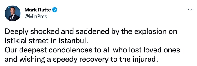 Hollanda Başbakanı Mark Rutte, resmi Twitter hesabı üzerinden başsağlığı dileyerek hüznümüzü paylaştığını belirtti.