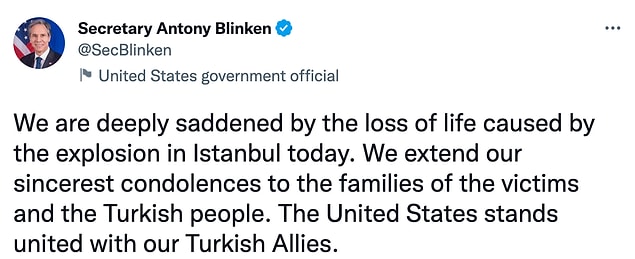 “İstanbul’daki patlamanın sebep olduğu hayat kaybından derin hüzün duymaktayız. Hayatını kaybedenlerin ailelerine ve Türk halkına en içten taziyelerimizi sunarız. Amerika Birleşik Devletleri, Türk müttefiklerimizin yanındadır.”