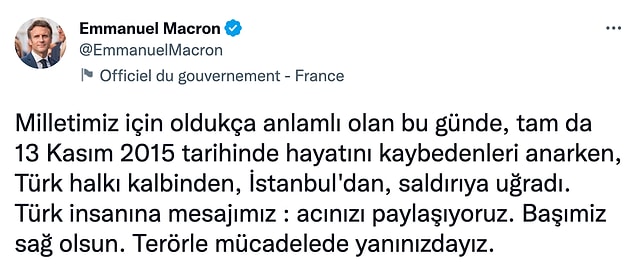 Fransa Cumhurbaşkanı Emmanuel Macron, ülkesi için değer taşıyan bu günde İstanbul’da yaşanan saldırıyı kınayarak hem Fransızca hem de Türkçe bildirilerle ‘Acınızı paylaşıyoruz’ dedi.