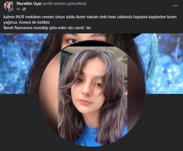‘Kabrin ışık, yerin cennet olsun datlu kızım. Taksim’deki hain atakta hayatını kaybeden kızım Yağmur, annesi ile birlikte ikindi namazına mutakip Şirinevler Ulu Camii’nde’ diyerek hüznünü lisana getirdi.