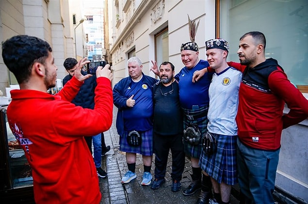 Geleneksel İskoç eteği kilt giyen taraftalar kendilerine gelen fotoğraf çektirme isteğini de geri çevirmedi.
