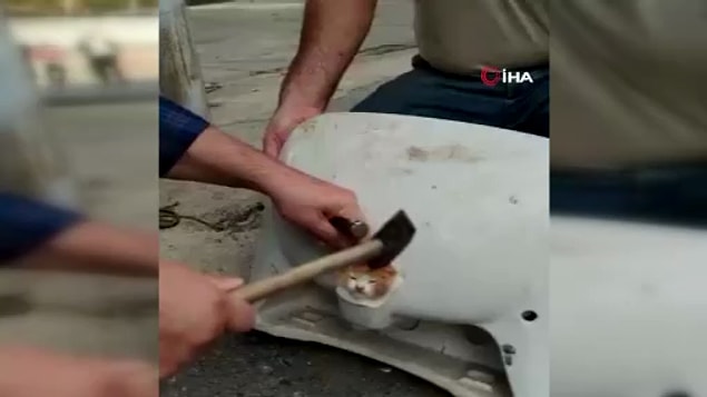 Karagümrük’te depoda çalışan inşaat personelleri, bir kedinin miyavlama sesini duydu. İnşaat ustası Tuncay Altun, sesin geldiği yere yanlışsız gidince lavabo deliğine sıkışmış yavru kediyi gördü. Altun, yavru kedinin sıkıştığı lavaboyu sökerek binadan dışarı çıkardı. İnşaatta çalışan başka emekçiler de kediyi kurtarmak için yardıma geldi.
