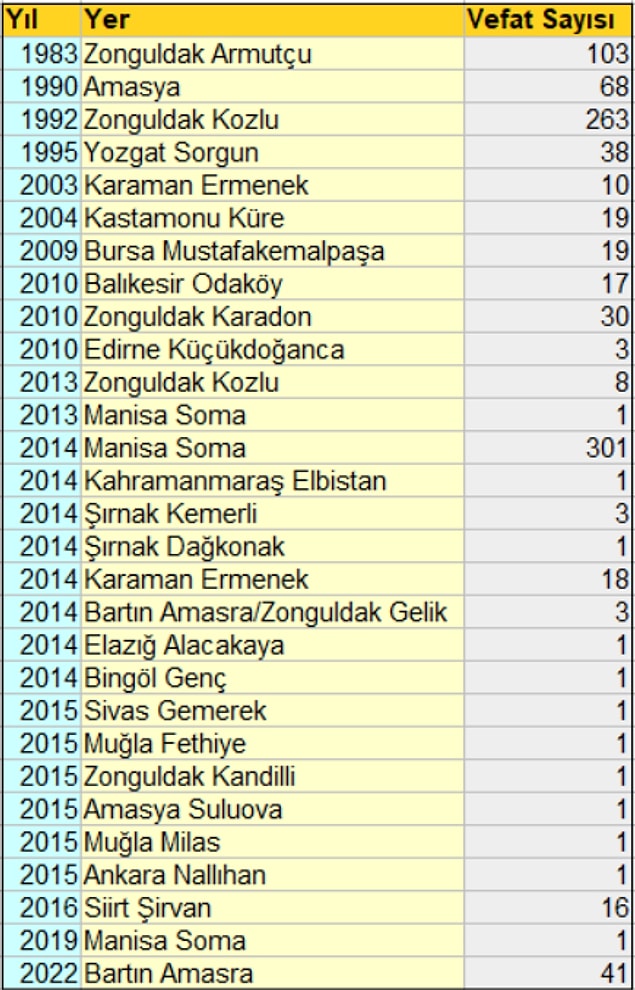 1983 yılından bu yana Türkiye’de meydana gelen maden ocakları patlamaları ya da çökmelerinde 972 kişi hayatını kaybetti.