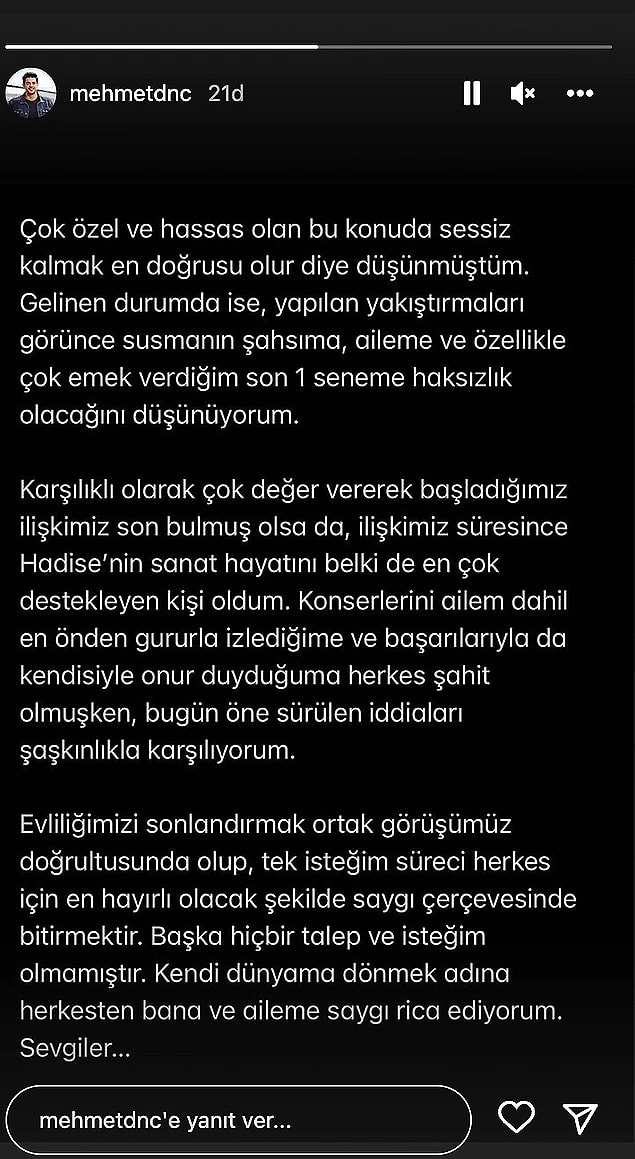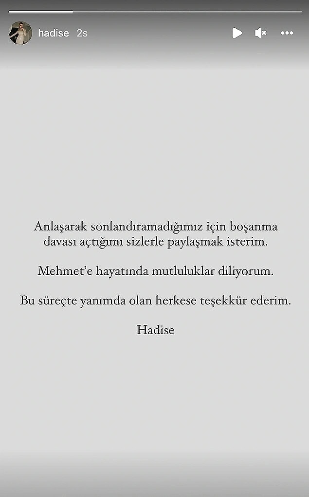 Tartışmalar devam ederken Hadise bir açıklama yaparak boşanacaklarını doğruladı lakin bu boşanmanın mutabakatlı biçimde olamadığını söyledi.