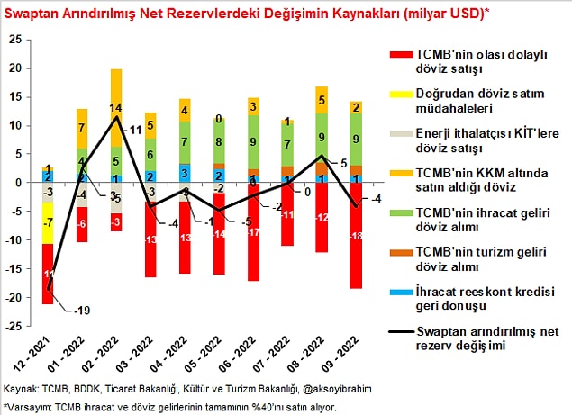 TCMB’nin ihracat ve döviz gelirlerinde yüzde 40 oranından yola çıkarak rezervlere buradan gelecek katkının 14,2 milyar dolar olduğu hesabıyla, görülen 4,2 milyar dolar azalma, ‘TCMB’nin Hazine ile olan protokolü kapsamında piyasaya geçen ay 18,4 milyar dolar civarında döviz arz etmiş olabileceğine işaret ediyor’ şeklinde değerlendirildi.