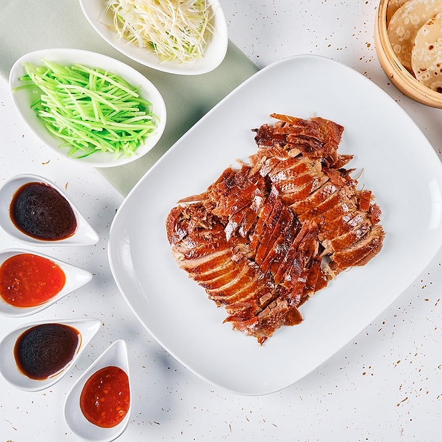 Bütün ördek; Soya & Mirin Marine, Çin yufkası, taze soğan, salatalık, hoisin sosis.