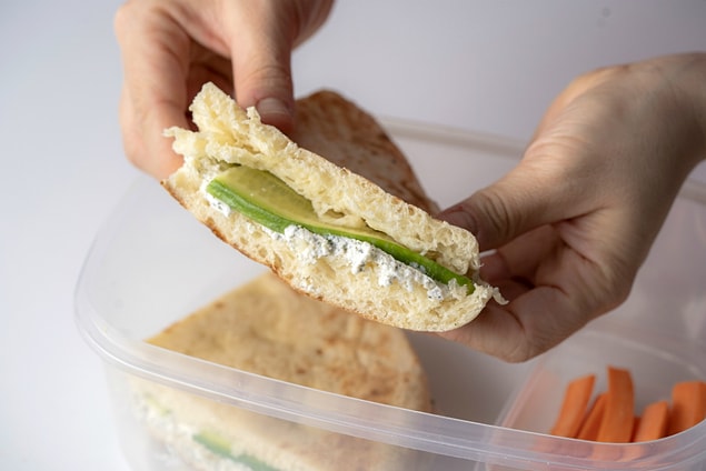 4. Salatalığı ince ince dilimleyin ve peynirin üzerine ekleyin. Sandviçlerin kalan üst dilimlerini salatalıkların üzerine yerleştirin ve yemek kabınıza üst üste koyun.