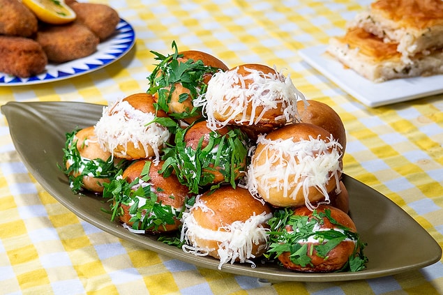 9. Labneli iç harçla doldurduğunuz poğaçaları rendelenmiş kaşar peynirine ve kıyılmış maydanoza batırın. Afiyet olsun.