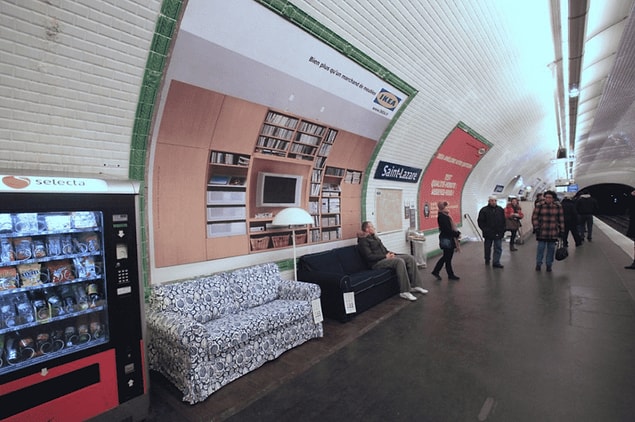 IKEA, mobilyalarının dayanıklılığını kanıtlamak istedi ve bunu yapmanın en düzgün yolunun halka açık metro istasyonlarında sergilemek olduğunu düşündü. Paris metrosunda farklı yerlere kanepeler, koltuklar ve lambalar yerleştirdiler. Hepsinin art fonunda kitaplık, televizyon ve IKEA logosu vardı. Eşyaların üzerindeki etiketlerde ise eserler hakkında bilgiler yazıyordu. İşte size dikkat çekmenin mükemmel bir yolu.