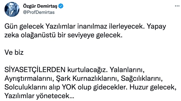 Demirtaş’ın yapay zeka hakkında yaptığı son paylaşım da Twitter kullanıcılarının radarına girdi. Demirtaş, gelişmiş yapay zekaların siyasetçileri ortadan kaldıracağı tezini ortaya attı.