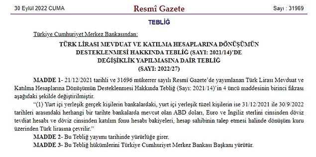 Tüzel şahısların kur muhafazalı mevduat sistemine dahil olmasını sağlayan düzenleme, 31 Aralık 2021 tarihinde bankalarda bulunan döviz hesapları için geçerli olacak şekilde başlamıştı. Daha sonra bu mühlet 30 Haziran tarihine kadar olan hesaplar formunda değiştirilmişti. Resmi Gazete’de yayımlanarak yürürlüğe giren yeni kararla müddet 30 Eylül’e uzatıldı.