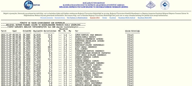Afet ve Acil Durum İdaresi Başkanlığı (AFAD) ve Kandilli Rasathanesi ülkemizde ve komşu ülkelerde meydana gelen tüm sarsıntı bilgilerini anlık olarak paylaşmaya devam ediyor.