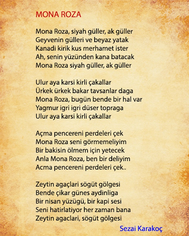 Mona Roza, siyah güller, ak güller…Karakoç’un yıllar sonra verdiği bir röportajda  ‘kimse bu şiirin bir akrostiş şiir olduğunu fark etmedi’ der. Lakin 30 yıl sonra bu şiirin bir akrostiş olduğunu kendisi açıklar ünlü şair. Böylelikle Mona Roza tüm okuyucuların gözünde farklı bir yer edinir adeta.