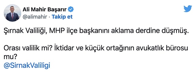 CHP Mersin Milletvekili Ali Becerikli Başarır da Şırnak Valiliği’nin MHP ilçe liderini aklama kederine düştüğünü söyledi. Başarır, ‘Orası valilik mi? İktidar ve küçük ortağının avukatlık ofisi mu?’ diye sordu.