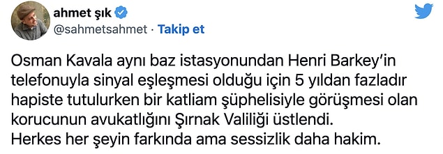 Türkiye Personel Partisi (TİP) İstanbul Milletvekili Ahmet Şık ise ‘Osman Kavala tıpkı baz istasyonundan Henri Barkey’in telefonuyla sinyal eşleşmesi olduğu için 5 yıldan fazladır mahpusta tutulurken bir katliam şüphelisiyle görüşmesi olan korucunun avukatlığını Şırnak Valiliği üstlendi. Herkes her şeyin farkında fakat sessizlik daha hakim’ yorumunu yaptı.