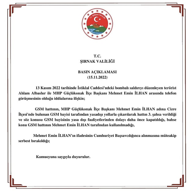 ‘GSM sınırının, MHP Güçlükonak İlçe Lideri Mehmet Emin İlhan ismine Cizre ilçesinde bulunan GSM bayisi tarafından yasadışı yollarla çıkarılarak çizginin üçüncü şahsa verildiği ve kelam konusu GSM bayisinin yasa dışı faaliyetlerinden ötürü daha evvel kapatıldığı, bahse mevzu GSM çizgisinin Mehmet Emin İlhan tarafından kullanılmadığı, Mehmet Emin İlhan’ın sözünün cumhuriyet başsavcılığınca alınmasına müteakip hür bırakıldığı kamuoyuna hürmetle duyurulur.’