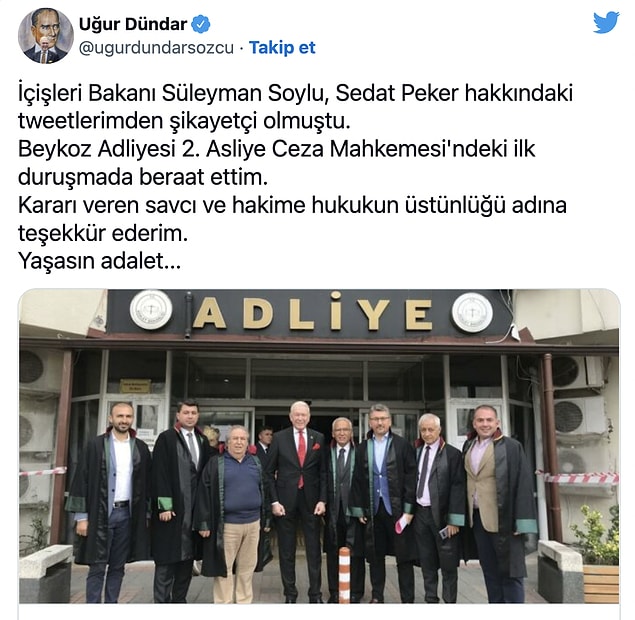 ‘İçişleri Bakanı Süleyman Soylu, Sedat Peker hakkındaki tweetlerimden şikayetçi olmuştu. Beykoz Adliyesi 2. Asliye Ceza Mahkemesi’ndeki birinci duruşmada beraat ettim. Kararı veren savcı ve hakime hukukun üstünlüğü ismine teşekkür ederim.Yaşasın adalet…’