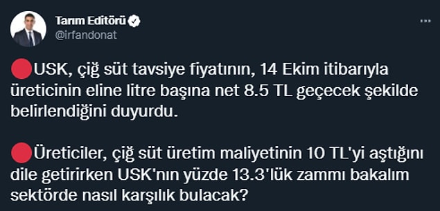 Ulusal Süt Kurulu, 14 Ekim tarihinden geçerli olmak üzere inek sütü tavsiye satış fiyatını üreticinin eline litre başına net 8,50 TL geçecek formda belirledi. Açıklamada şöyle denildi: