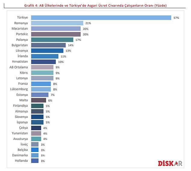 DİSK Araştırma Merkezi (DİSK-AR) tarafından yapılan araştırma da taban fiyat civarı ve altında çalışanların oranı yüzde 57.
