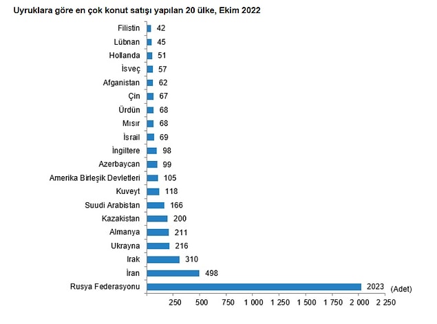Ekim ayında Rusya Federasyonu vatandaşları Türkiye’den 2 bin 23 konut satın aldı. Rusya Federasyonu vatandaşlarını sırasıyla İran, Irak ve Ukrayna vatandaşları izledi.