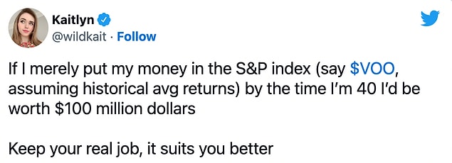 40 yaşıma kadar paramı sadece S&P endeksine koyarsam (tarihi ortalama getirilerini varsayarak $VOO diyelim), varlığım 100 milyon dolar pahasında olur. Gerçek işine devam et, sana daha çok yakışıyor.