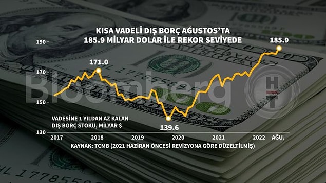Ağustos sonu prestijiyle, kısa vadeli dış borç stoku, 2021 yıl sonuna nazaran %13,6 oranında artışla 138,1 milyar ABD doları oldu. Bankaların borçlarında bir azalış seyri görülürken, gerçek dalın dış borçlarının arttığı görüldü. Yepyeni vadesine bakılmadan vadesine 1 yıl ve/veya daha az kalmış dış borç verisinde stok 185,9 milyar dolar olurken, rekor kırıldı.